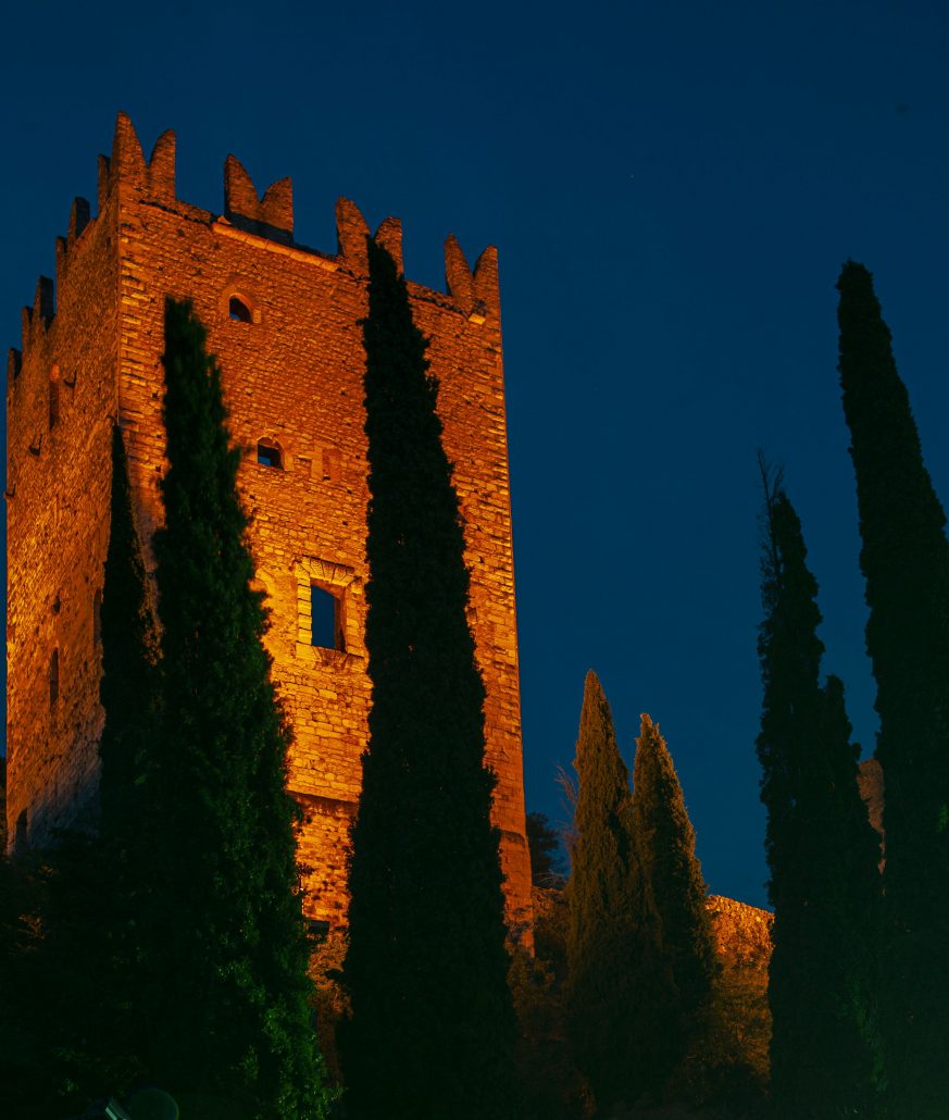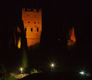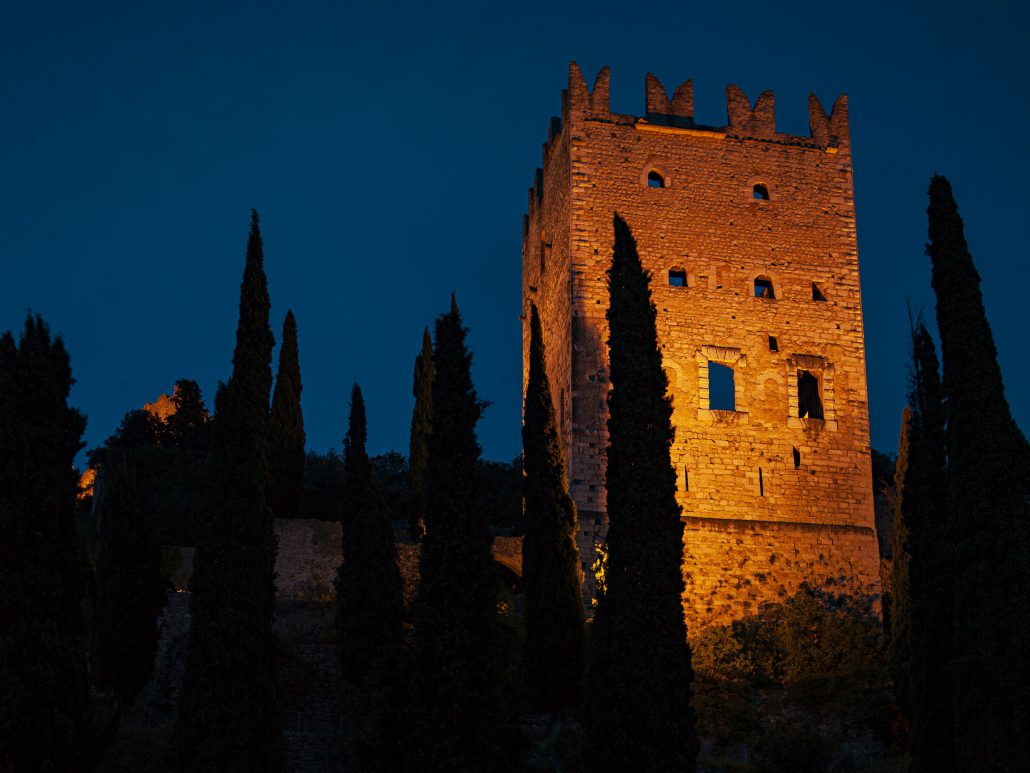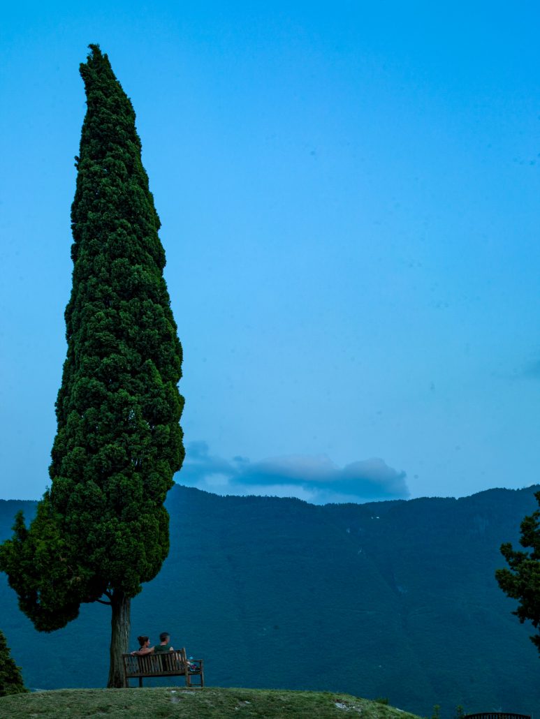 Diesmal haben wir uns auf den Weg gemacht das Castello auf dem Felsen über Arco anzuschauen. Leider war es schon geschlossen. Aber unterhalb gibt es auf einer Wiese eine kleine Bar, die noch geöffnet hatte. Von hier aus hatten wir einen ganz anderen Blick auf den See. Es wurde dunkel und das Castello direkt über uns wurde angeleuchtet.