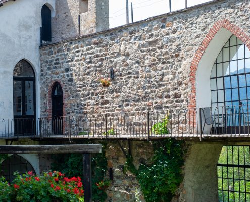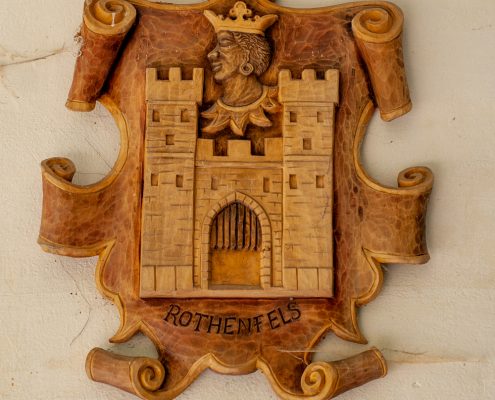 Den Namen hat die Burg vom roten Felsen bekommen, auf dem sie gebaut wurde. Da dieser Granit so hart war, dass er damals nur mühsam bearbeitet werden konnte haben die Baumeistern die Burg einfach auf und um den Felsen herum gebaut. Deshalb gibt es viele verwinkelte Treppen und Räume. Dazwischen kommt immer wieder der Fels zum Vorschein.