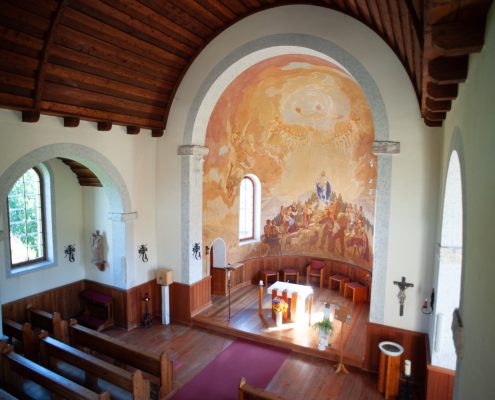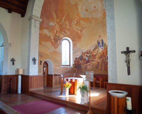 Innen beeindruckt die Schlichtheit: Einfache weiße Wände wechseln sich ab mit rötlichem Holz. Besonders beeindruckend ist das Fresko im Altarraum. Es wurde von dem Kunstmaler Toni Hafner erschaffen und zeigt alle wichtigen Elemente des katholischen Glaubens zusammengefasst in einem herrlichen Bild.