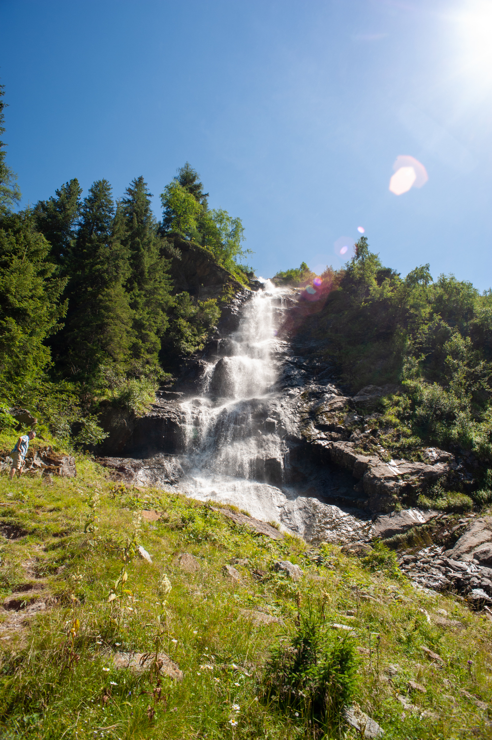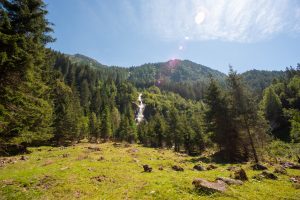 Auf dem Weg zum Sölkpass zweigt ein Tal ab, durch das sich ein kleiner Bach zieht. Am Ende wird das Tal breiter und dort finden wir einen Wasserfall. Kuh müsste man sein. Hier darf jede Kuh so weit laufen, wie sie kann. Irgendwann wird es zu steil also ist auch kein Zaun notwendig. Einmal müssen wir eine Herde auseinander treiben, weil sie auf dem Weg herumstehen und ein Palaver abhalten.